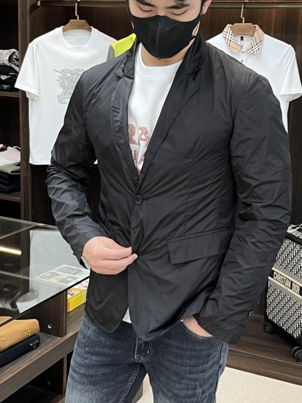 Prada new single-breasted suit jacket Prada classic elegance and ingenuity coexist in the design of this single-breasted Re-Nylon suit jacket. Tailored lines and functional details, notch lapels, back slits, front center button closure, three buttons on the sleeves, flap welt pockets, unlined, Prada classic fabric triangle logo on the back, novel and fashionable style, highly recommended!