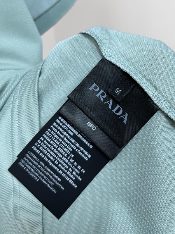 Prada’s new triangle micro logo polo shirt This cotton polo shirt from Prada presents a casual look full of sporty vitality and outlines classic lines. Short sleeve design, with glittering buttons and the iconic triangle logo in the same color reinterpreted with a conceptual design. Highly recommended!