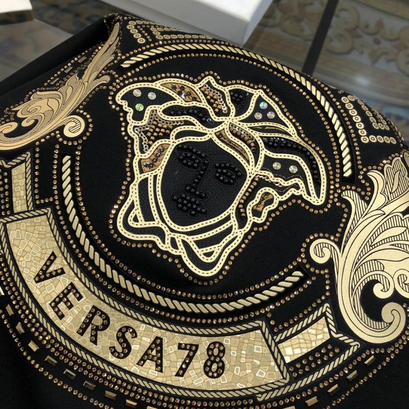 Versace Spring and Summer new original men’s round neck short-sleeved T-shirt, high-end customization, fashionable and versatile, counter simultaneous sales, printed rubber hot diamond Medusa logo pattern design, customized imported jade silk fabric, skin-friendly and comfortable to wear, soft and breathable fabric, very delicate to the touch. The lining is all made of single-needle lock-edge technology! It can ensure that it will not be deformed when worn! Well-cut, without any sense of restraint, fine workmanship of the OEM factory, showing temperament and grade, very handsome on the upper body Size: M-4XL (the largest size can wear about 195 pounds, please report height and weight when placing an order)